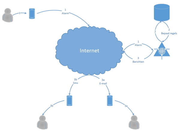Paniekmelding.nl ontvangt de melding en herkent de melder. Paniekmelding.nl bepaalt conform de instellingen van uw school hoeveel medewerkers u wilt alarmeren en op welke manier (e-mail en/of sms). E-mailberichten en/of SMS-berichten worden verstuurd aan de te alarmeren medewerkers.